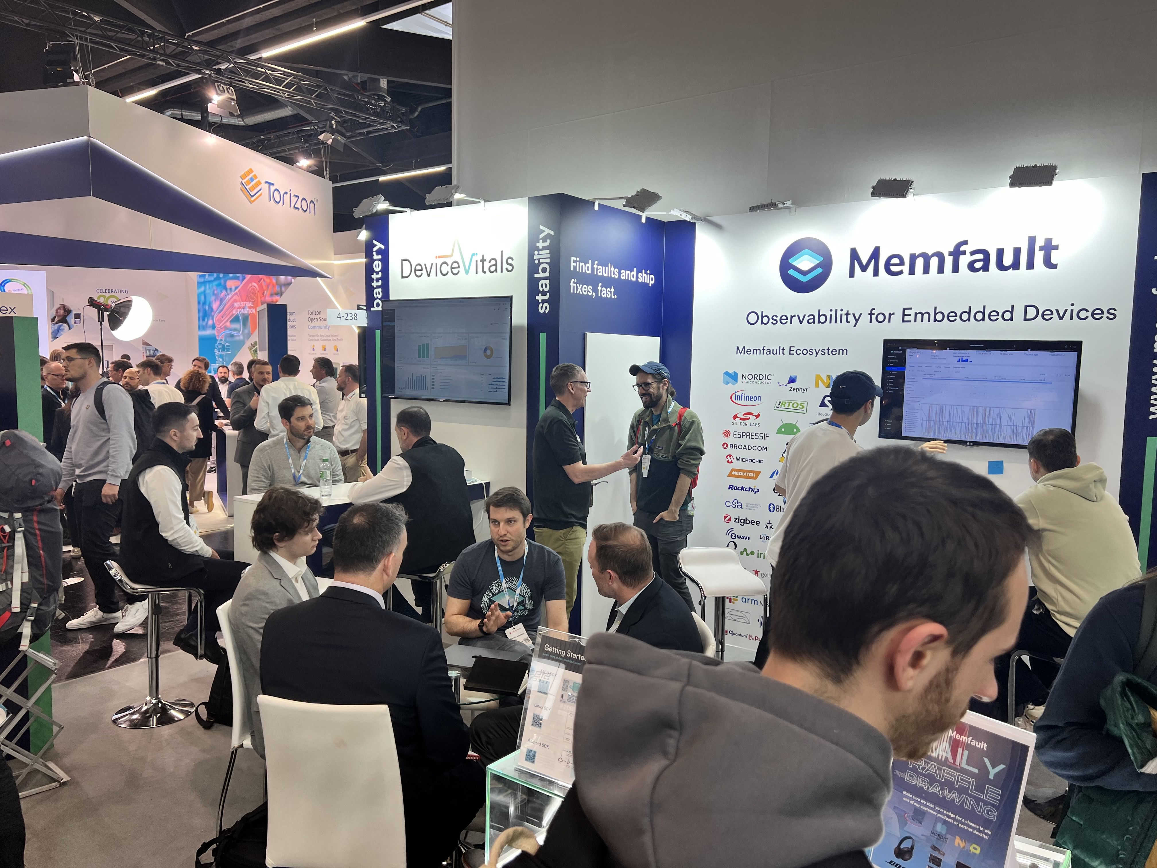 I spent a lot of time at the Memfault booth of course. It was thrilling to meet so many engineers who wanted to learn more about observability. We welcomed hundreds of people at our booth, with 4 demo stations in active use throughout the 3 days of the show. The Memfault socks we brought as booth swag were a big hit.